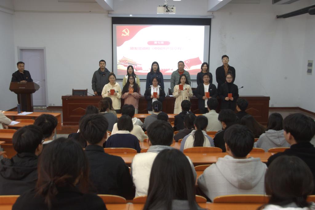与会领导、老师逐一为新党员颁发党员徽章和《中国共产党章程》。