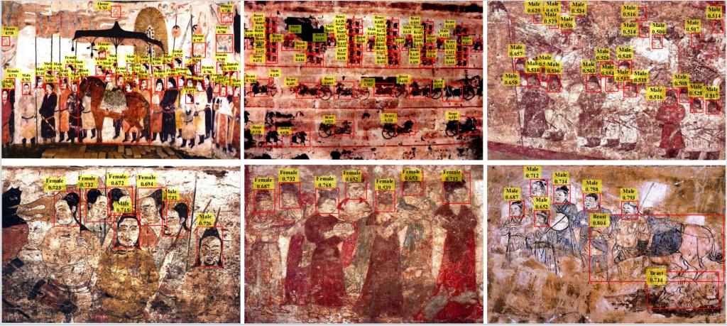 壁画元素包含人物、车马、花鸟、祥云等,对这些元素的数字化研究能更好地帮助我们理解历史与文化。该论文针对中国古代出土的壁画元素构建了大规模目标检测数据集,其标注样本类别丰富多样且跨越不同历史时期与地域,对中国古代历史研究具有重要价值。同时针对壁画存在的残缺问题,开发了自适应随机擦除数据增强算法,迫使模型学习更全面的特征信息,使其适应壁画的残缺场景。此外创建了中国古代壁画元素目标语义特征提取模型,利用上下文信息与残差注意力机制捕捉语义信息,提高了元素目标检测的准确率。最后在构建的壁画数据集上,将该论文提出的检测方法与其他几种先进的目标检测算法进行对比分析,可视化结果验证了本文方法的优越性。