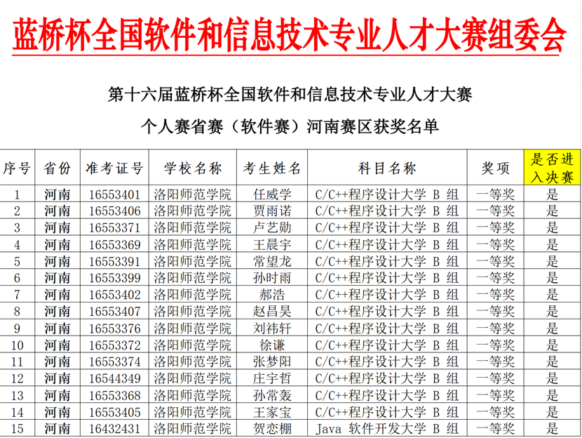 近日,第十六届“蓝桥杯”全国软件和信息技术专业人才大赛个人赛河南省赛成绩揭晓。经过激烈角逐,信息学子再创佳绩,喜获省一等奖15项、省二等奖29项、省三等奖55项。