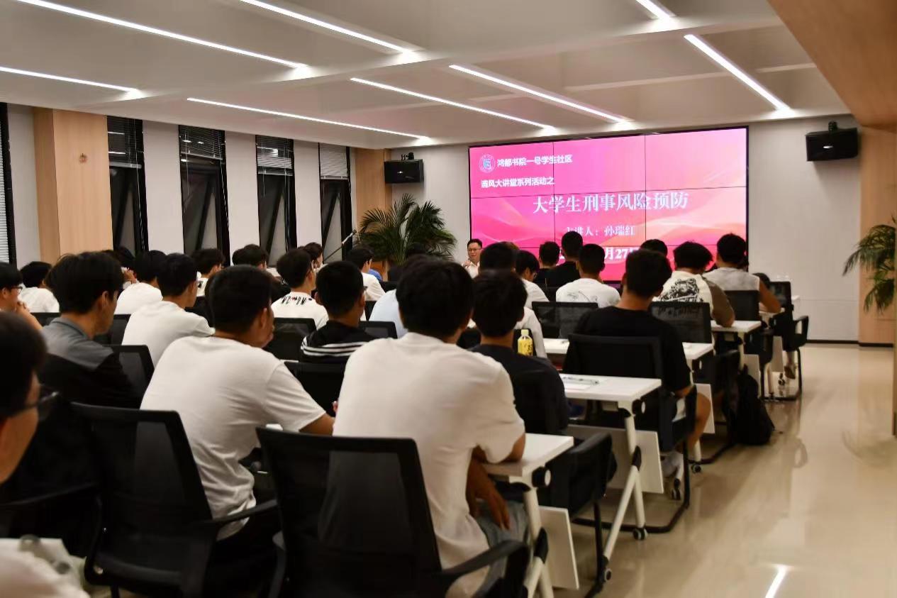 为进一步强化大学生法治意识,教育引导大学生增强敬畏意识、底线意识,严守纪法红线,争做社会主义核心价值观的积极践行者。2024年9月27日晚,鸿都书院一号学生社区特邀请河南森合律师事务所主任孙瑞红作“大学生刑事风险预防”专题辅导报告。书院社区育人导师代表、学生干部代表及2024级新生代表近百人参加。会议由书院社区党委副书记李海瑞主持。