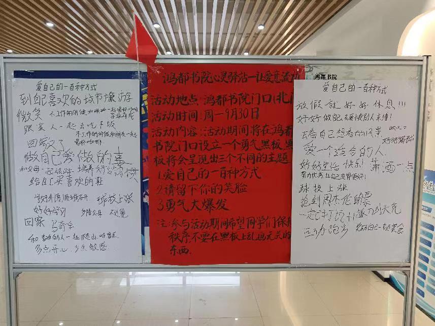 此次鸿都书院1号学生社区“心灵驿站——让爱意流动”主题活动的成功举办,不仅为师生们提供了一次难得的心理健康教育和情感交流的机会,能也进一步推动了学校心理健康教育工作的深入开展。未来,鸿都书院1号学生社区将继续秉承“以人为本”的教育理念,关注师生心理健康,营造更加和谐美好的社区环境。