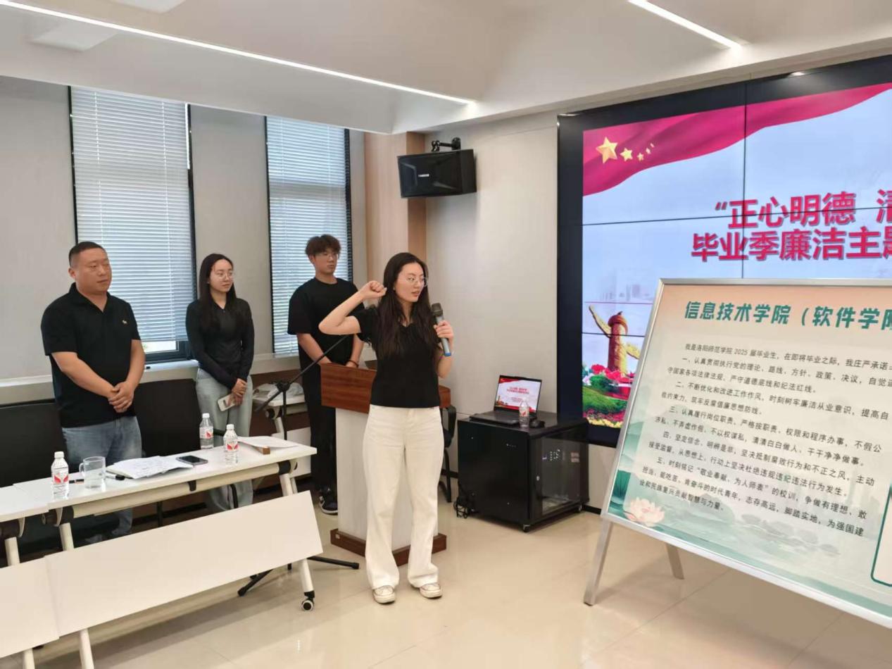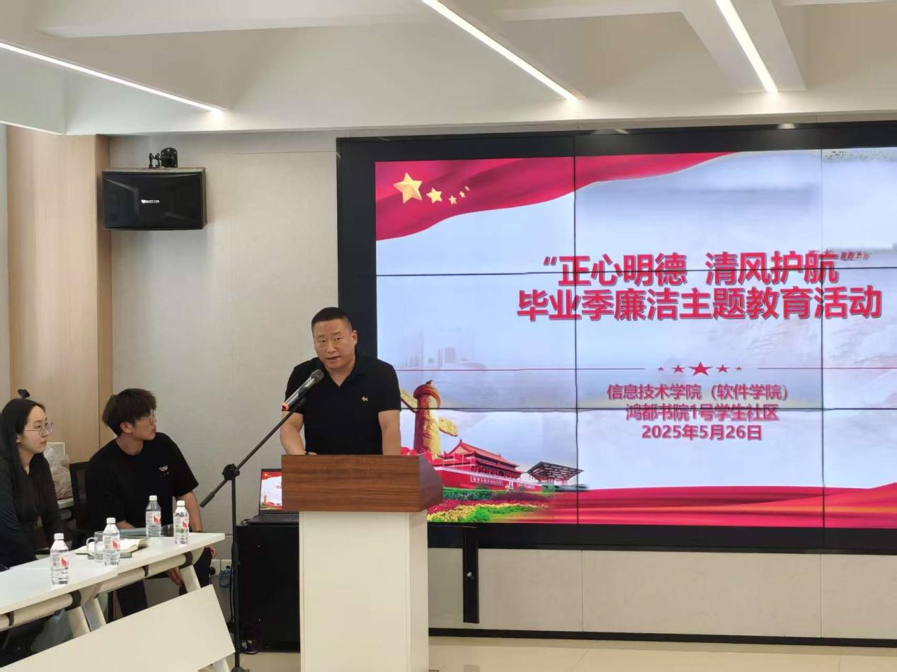 为加强新时代廉洁文化建设,教育引导毕业生植廉于心、践廉于行,扣好步入社会的“第一粒扣子”,推动清廉洛师建设落地见效。5月26日,信息技术学院联合鸿都书院1号学生社区举办“正心明德 清风护航”毕业季廉洁主题教育活动。书院社区党委副书记李海瑞、学院全体育人导师及高质量就业学生代表共50余人参加。