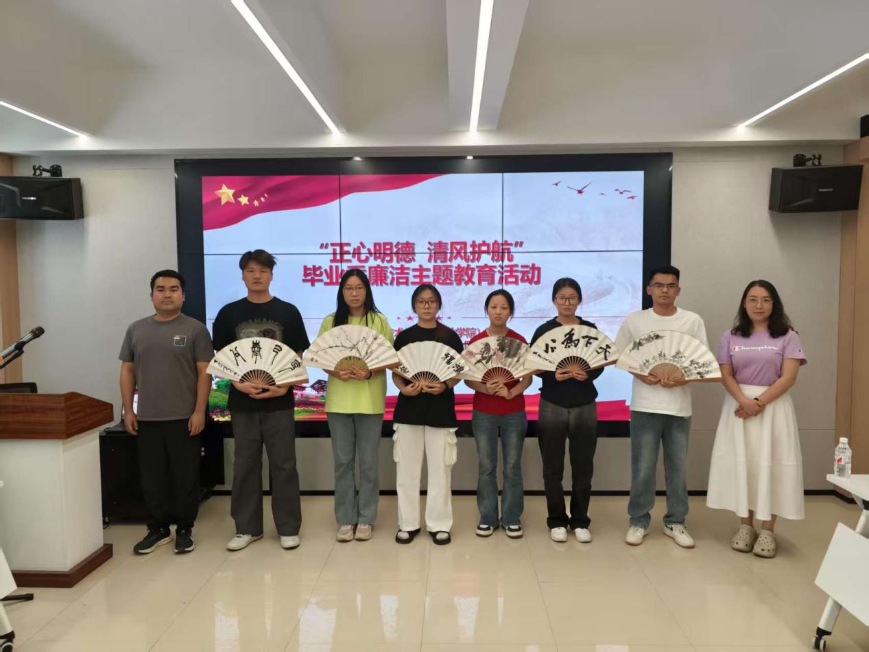 毕业班辅导员分别为高质量就业学生代表颁发了廉洁扇。该扇主要是将新时代廉洁文化、红色文化、传统文化融入丹青翰墨,围绕立志、修身、律己等方面进行创作,希望毕业生们领略传统艺术之美,同时汲取廉洁意蕴,涵养崇洁尚廉之风。