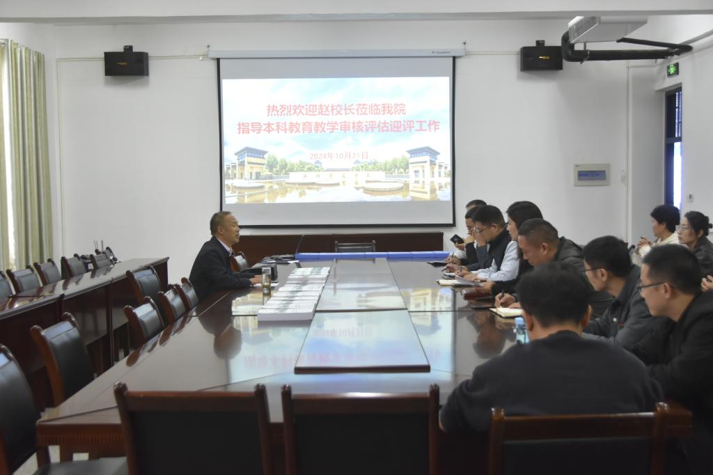 院长张永新就学院本科教育教学审核评估工作准备、学院概况、教育教学特色、存在问题及改进举措等内容作了详细汇报。赵邦屯对学院在本科教育教学审核评估工作中所做的努力和取得的成效给予了肯定。他强调,一要以此次本科教育教学审核评估为契机,进一步凝练学院特色,理顺发展思路,推动学院事业高质量发展;二要对照《国标》,明确短板弱项,制定整改举措,切实提升本科教育教学的质量;三要积极动员全体师生员工,主动担当作为,形成“人人知晓评估 人人参与评估 人人贡献评估”的氛围,高质量完成本次教育教学审核评估工作。