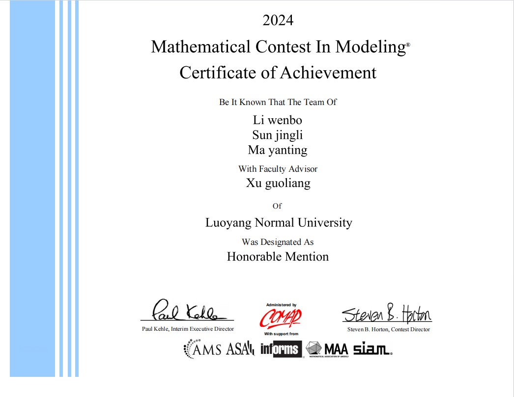 近日,2024年美国大学生数学建模竞赛(MCM/ICM)成绩揭晓。经激烈角逐,信息技术学院学子李文博凭借出色的表现,斩获国际二等奖的优异成绩,实现了学院在此次竞赛的零突破。此次竞赛由我院学子牵头,与四川大学、郑州经贸学院学生组建团队,联合参赛,徐国梁老师全程参与指导,竞赛题目为MCM PROBLEM B: Searching for Submersibles。