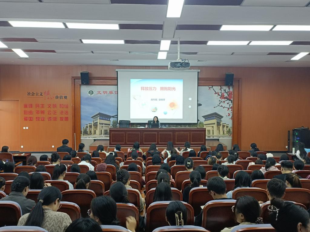 10月24日下午,洛阳师范学院教育科学学院优秀教师徐晓芳应邀做客教育硕士卓越教师论坛,于逸夫教学楼5号楼102报告厅为同学们带来了一场题为《释放压力,拥抱阳光》的精彩讲座。讲座由党委研究生工作部(研究生处)副部长(副处长)朱利阳主持,2024级全体研究生现场聆听。