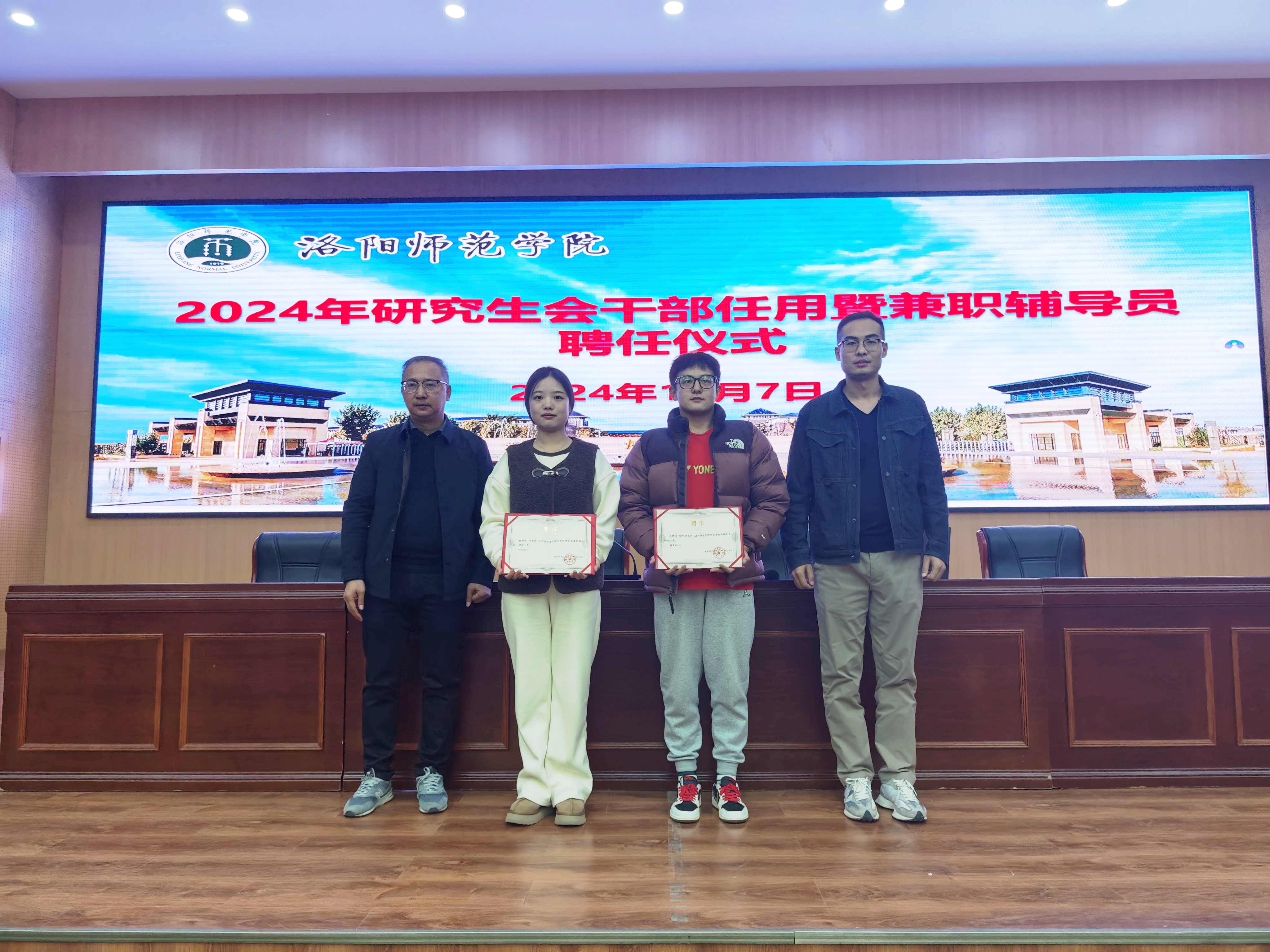 谭勇刚为明朝和郑梦欣颁发兼职辅导员聘书。随后,明朝和郑梦欣做表态发言,纷纷表达了努力做好兼职辅导员工作的决心。