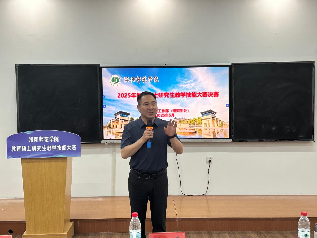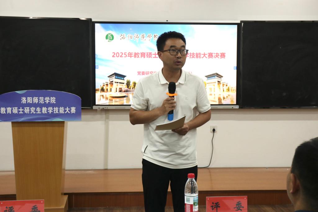 为深化教育硕士专业学位研究生培养模式改革,全面提升教育硕士研究生实践教学能力,5月15日下午,我校2025年教育硕士研究生教学技能大赛决赛于逸夫楼G3-111教室圆满举行。本次决赛特邀洛阳市第八高级中学副校长张刘邦、洛阳师范学院附属高级中学副校长张轲轲以及我校教育科学学院副教授周显峰、数学科学学院副教授薛琳、马克思主义学院副教授杨正群担任评委。经学院初赛,来自14个学院的20名研究生晋级决赛。