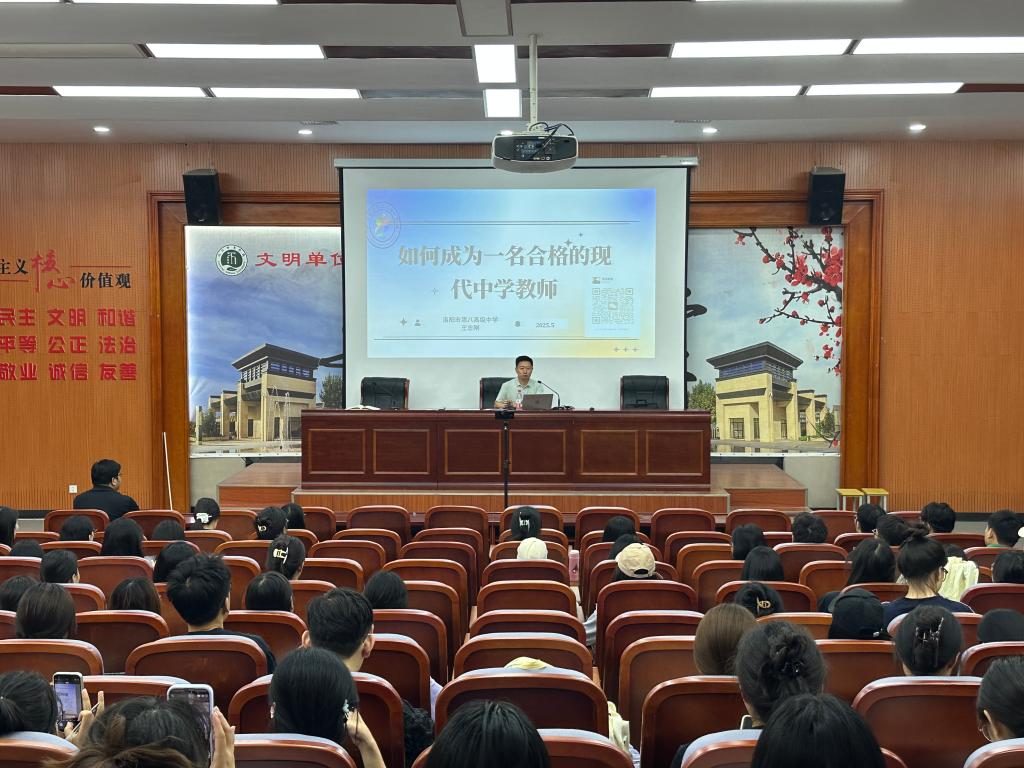 5月22日下午,洛阳市第八高级中学副校长王志刚应邀做客教育硕士卓越教师论坛,于逸夫教学楼G5-402报告厅为2024级研究生带来了一场题为《如何成为一名合格的现代中学教师》的精彩讲座。讲座由党委研究生工作部(研究生处)副部长(副处长)朱利阳主持。