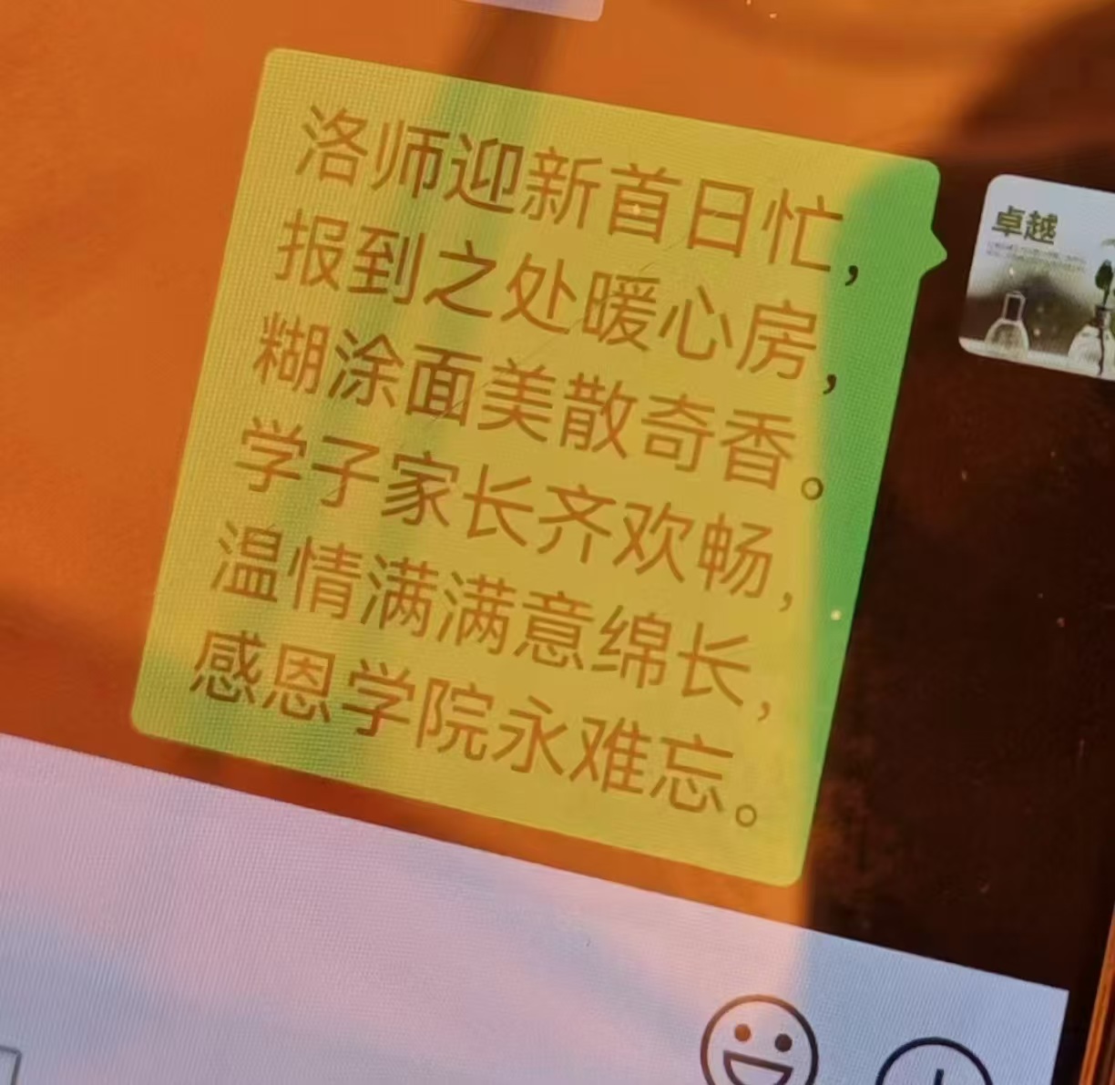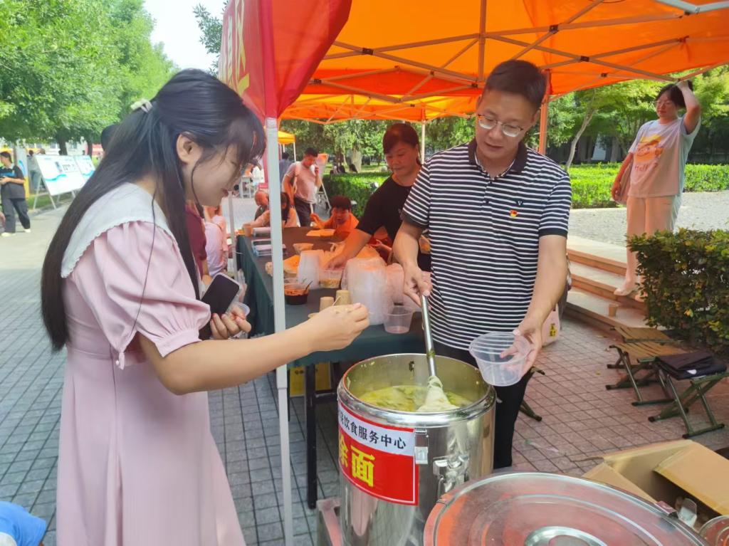 迎新当日,饮食服务中心为做好就餐服务,餐厅所有班组全天不间断供餐,并分别在桃园、李园、桂园、枣园餐厅门口增设党员志愿爱心服务点,精心布置搭建帐篷,为新生和家长们免费供应梨、苹果、香蕉、橘子等多种水果,用“水果谐音”迎接新生,回馈老生。同时在图书馆广场、鸿都广场供应洛阳特色糊涂面,深得新生家长深情作诗称赞。