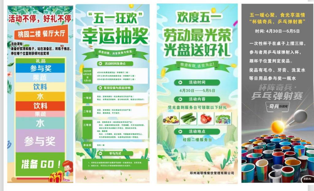当“五一”劳动节遇上“五四”青年节,饮食服务中心动员各餐厅为留校师生精心策划了一场“美食+趣味+情怀”的温暖庆典。校内四大餐厅各显神通,以创意游戏、趣味抽奖和暖心福利,为师生们打造专属的节日记忆。