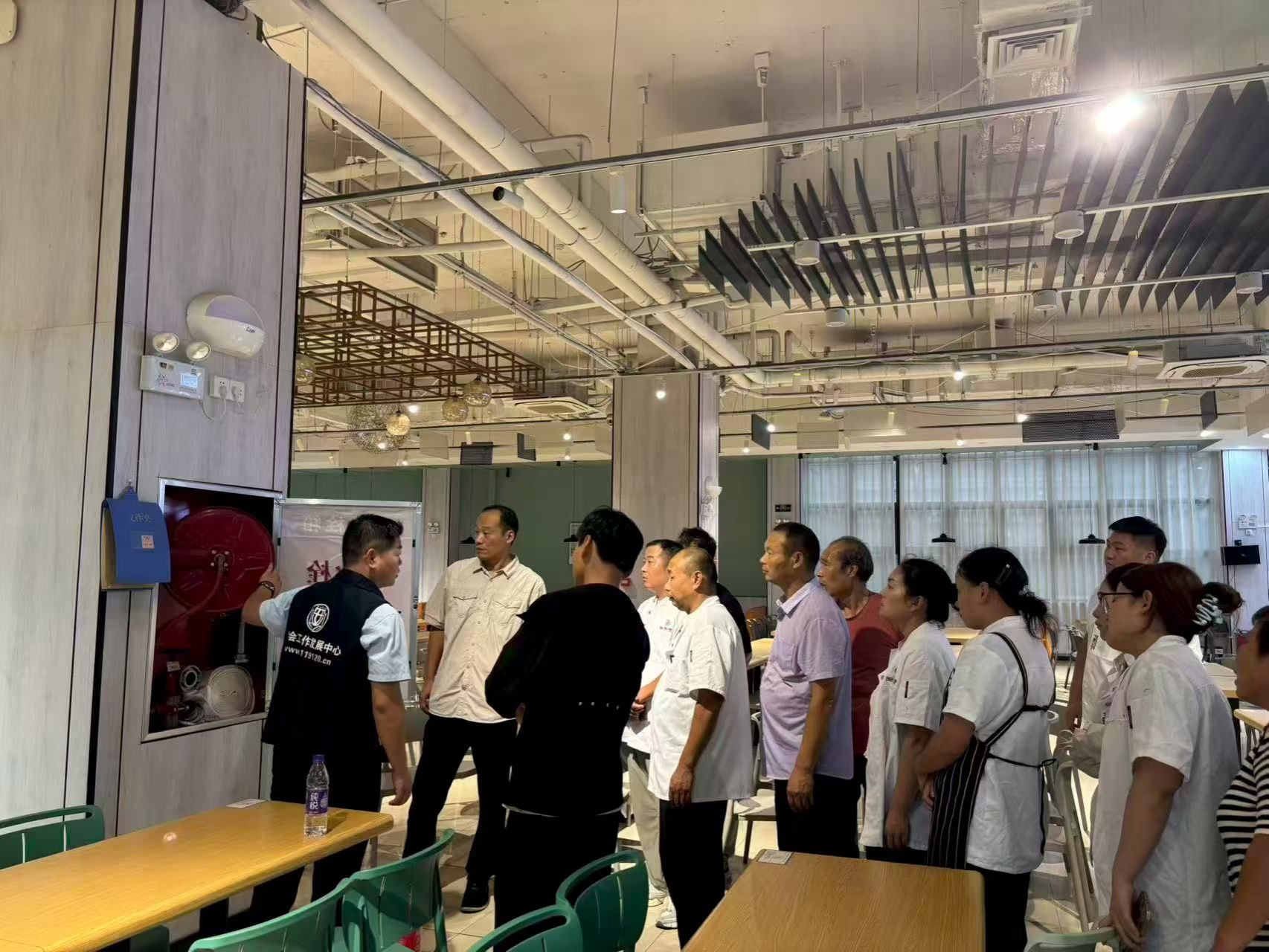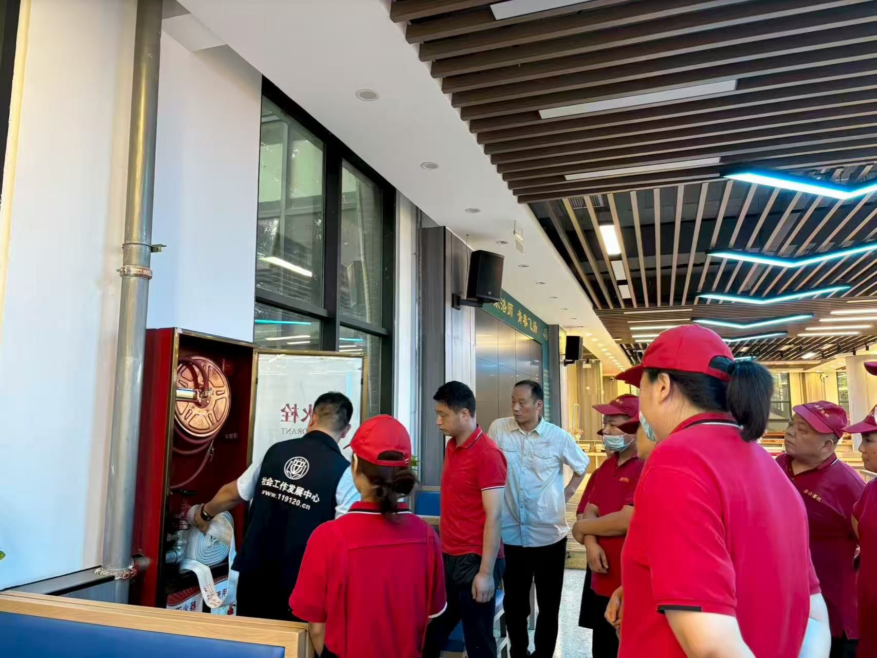 实际操作演练部分:教员深入中心管理的6个餐厅,对消防栓、灭火器、灭火毯的使用方法、火灾逃生技巧以及如何组织人员疏散等内容进行了现场演示和指导,确保每位员工都能熟练掌握消防器材的使用,能够在火灾初期迅速有效地进行扑救。