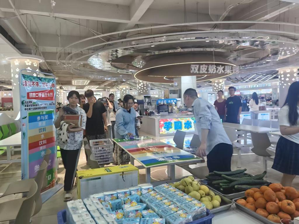 桃园餐厅以“青春劳动季”为主题,推出“幸运滚滚乐”小游戏。师生参与互动即可赢取雪碧、可乐、优酸乳等夏日饮品,另外还有黄瓜、圣女果等健康果蔬。“手速+运气”的组合让清凉一夏触手可及,劳动的喜悦与健康的美味交织在一起。