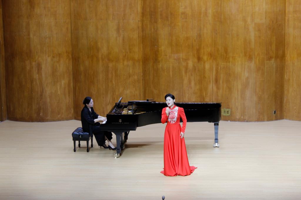 音乐会上,歌者们纷纷登台献艺。第一个登台的是李亚东研究生三年级的学生廖海欣,她演唱了一首古诗词歌曲《卜算子•咏梅》和一首陕北民歌《兰花花》,瞬间把现场气氛活跃起来。随后王子开同学为观众带来《定风波•莫听穿林打叶声》和《春江花月夜》,高超的演唱技巧使现场观众赞不绝口。接下来许一钒带来了两首别样民族风格的歌曲,一首新疆民歌《牡丹汗》,一首藏族风格的《扎西德勒》。周相如带来的曲目《来不及》是歌剧《扶贫路上》的选段,讲述了广西百色市乐业县百坭村原第一书记黄文秀在扶贫路上的感人事迹,表现了青年一代扶贫干部为了贫困地区脱贫,带领大家努力致富的坚定信念和奉献精神。岳益飞演唱的《黄河船夫曲》完美演绎了黄河船夫的艰辛和勇敢,激发了观众的热血和激情。最后张丽老师再次带来她在金钟奖比赛时期的两首参赛曲目,陕北民歌《小桃红》和《老祖先留下个人爱人》,深情动人的歌声让人陶醉其中。