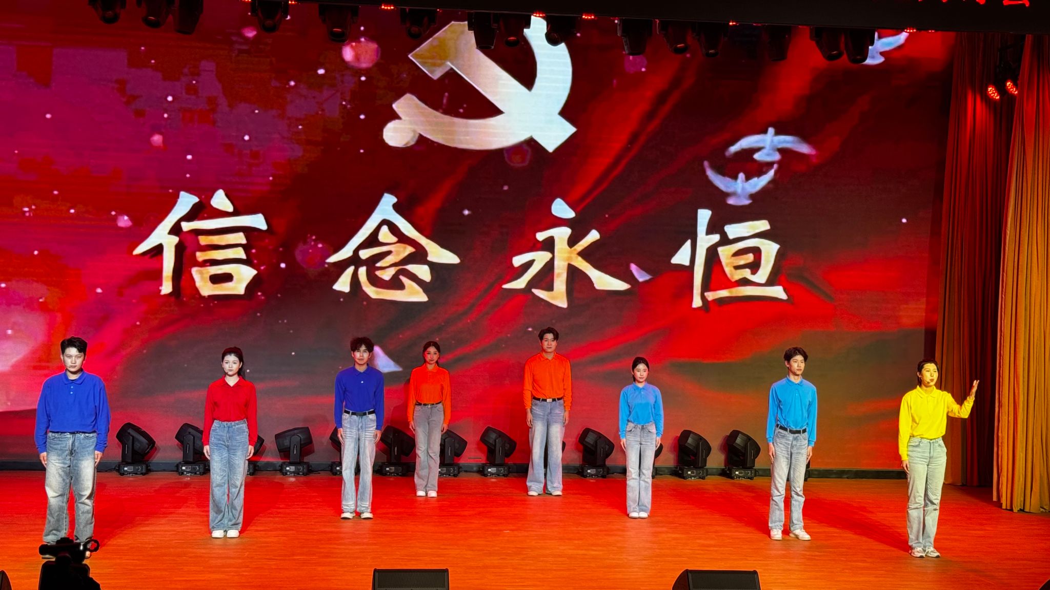 创意朗诵《黄河》以铿锵诗句描绘黄河的磅礴气象,展现中华儿女不屈不挠的奋斗精神;《生活在英雄们的中间》深情重现了烽火岁月里的英雄风貌与崇高精神,引发全场深切共鸣;原创讲述《藏书有声·薪火相传的党刊》于无声纸页中聆听有声信仰,将红色文献背后的初心故事与薪火相传的动人历程娓娓道来;《我用星光把祖国点亮》以神舟二十一号成功发射为背景,赞颂中国航天人以赤子之心托举大国重器的逐梦精神;合诵《信念永恒》带领观众回顾党的百年征程,以赤诚之声汇聚奋进力量,将现场气氛再次推向高潮。