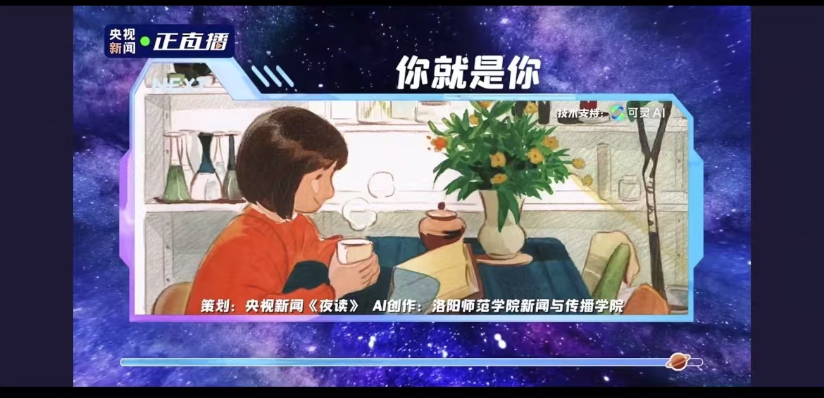 据悉,《你就是你》作为央视夜读栏目的年终MV,不仅凝聚了多方智慧与力量,更代表了科技与文化的完美融合,向大众传达出一个核心情感:我们每个人都是独特的存在,应该拥抱自我,勇敢追梦,坚定地走在成为自己的道路上。该MV由央视新闻《夜读》策划,我校新闻与传播学院师生团队历时10天完成AI创作,标志着我校在AIGC影像创意生产领域取得新突破,是产教融合创新实践的重要成果。