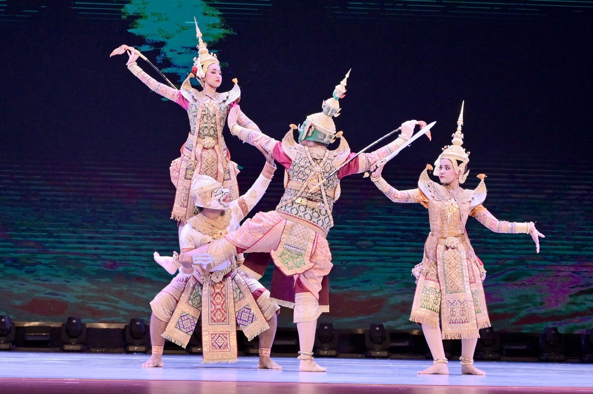整场展演以“艺韵共传承”为主线,中泰节目交替呈现,精彩纷呈。泰方带来了国家级非遗孔剧《罗摩衍那》经典片段《出征》与《哈努曼擒素攀玛查》,以面具舞剧再现史诗传奇;北、中、南、东北四大区域民间舞蹈依次登台,涵盖柔美的指甲舞与烛舞、激昂的萨查特里舞、典雅的诗暖舞以及融合“鬼面舞”元素的依善舞,展现了泰国多元文化魅力;压轴的泰拳舞蹈以“拜师舞”开场,融合仪式与技艺,彰显了力量与敬畏。