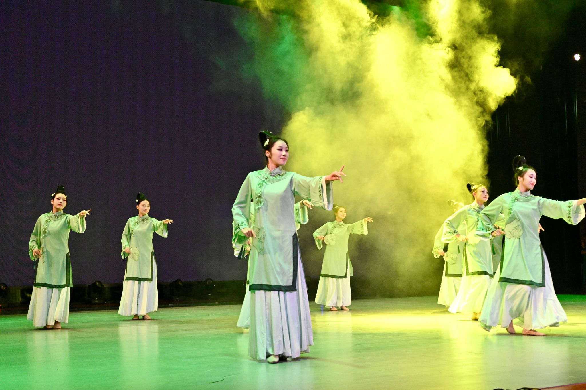我校节目同样亮点纷呈:吹打乐《龙舞丰年》《农家乐》奏响了乡村振兴的欢歌;舞蹈《河洛·焦骨》以“焦骨牡丹”传说诠释了坚韧风骨;古筝合奏《西部主题畅想曲》描绘了辽阔西域风情;《清风徐来》再现了清代仕女图的雅致意境;歌伴舞《看山看水看中国》纵览祖国山河,抒发了家国情怀。