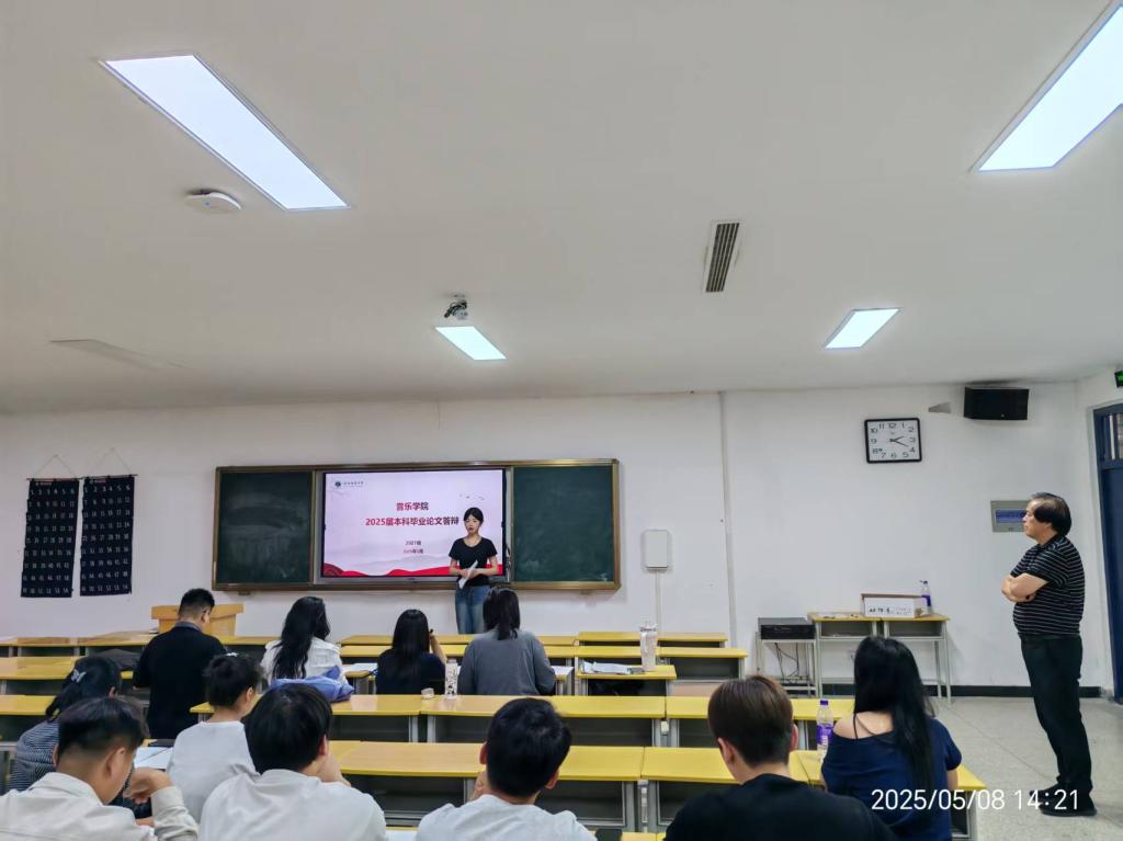 洛阳师范学院音乐学院2025届本科生论文答辩工作于5月8日圆满落幕。此次答辩旨在全面检验学生专业知识掌握程度与学术研究能力,进一步提升人才培养质量,学院高度重视,精心组织安排,学院骨干教师组成答辩评审组,确保答辩工作严谨、规范、有序开展。