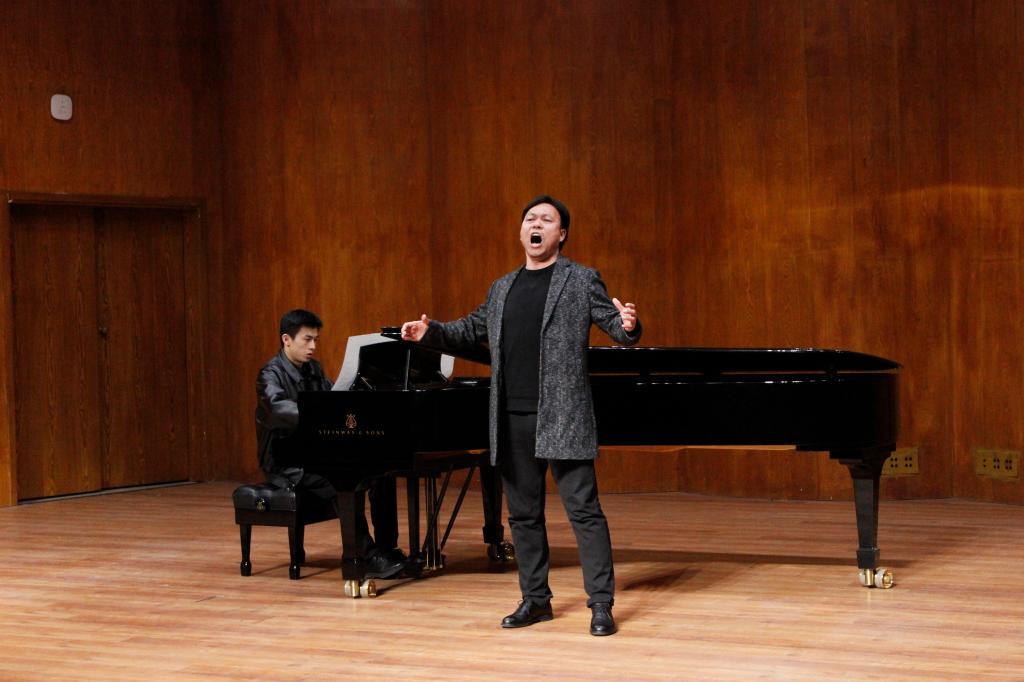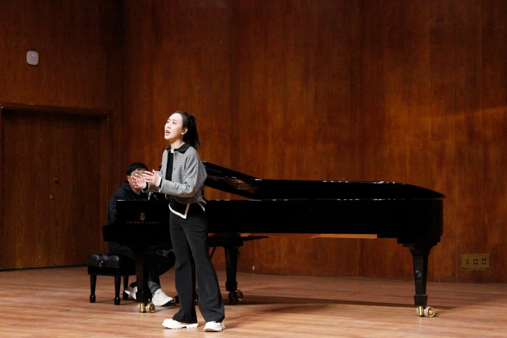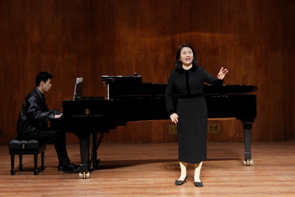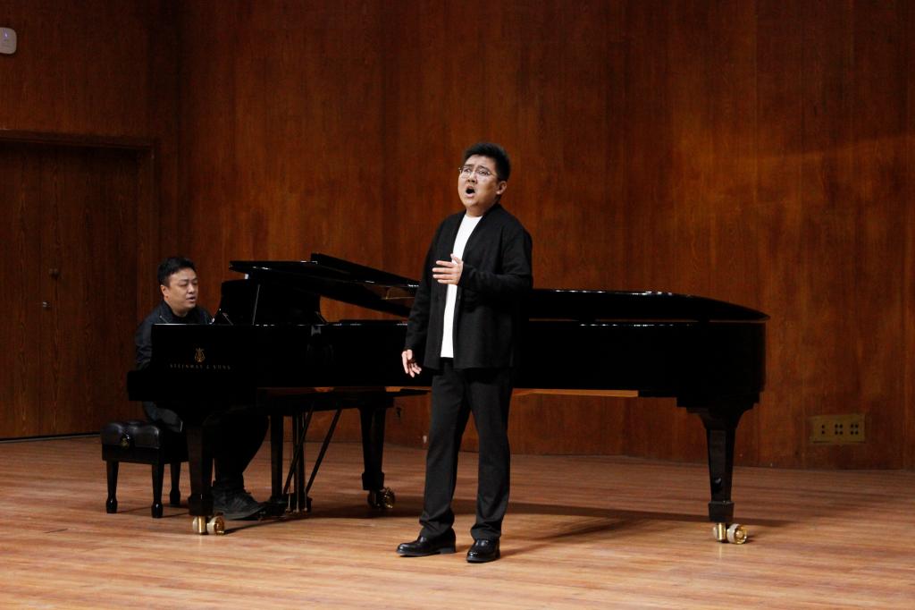 音乐会以声乐独唱的形式呈现。一首陕北民歌《上一道坡坡下一道梁》拉开了音乐会的序幕。《老家伙在找老婆》让人不禁随着轻快、活泼的曲调律动;《千古绝唱》勾勒出一段跨越千年的凄美爱情故事,感心动耳,回肠荡气;《升起吧,太阳》优美的旋律搭配演唱者细腻的情感处理带动了全场的气氛。青年教师们精彩绝伦的演唱如山涧潺潺的流水般婉转悠扬,又如大海滚滚的浪花般激荡人心、扣人心弦。随后,中国艺术歌曲、意大利歌曲、民族歌曲以及原创歌曲等作品纷至沓来。青年教师们共演绎了二十一首作品,音乐会持续了近两个小时,最后,在歌剧选段《沂蒙的女儿》中落下帷幕。
