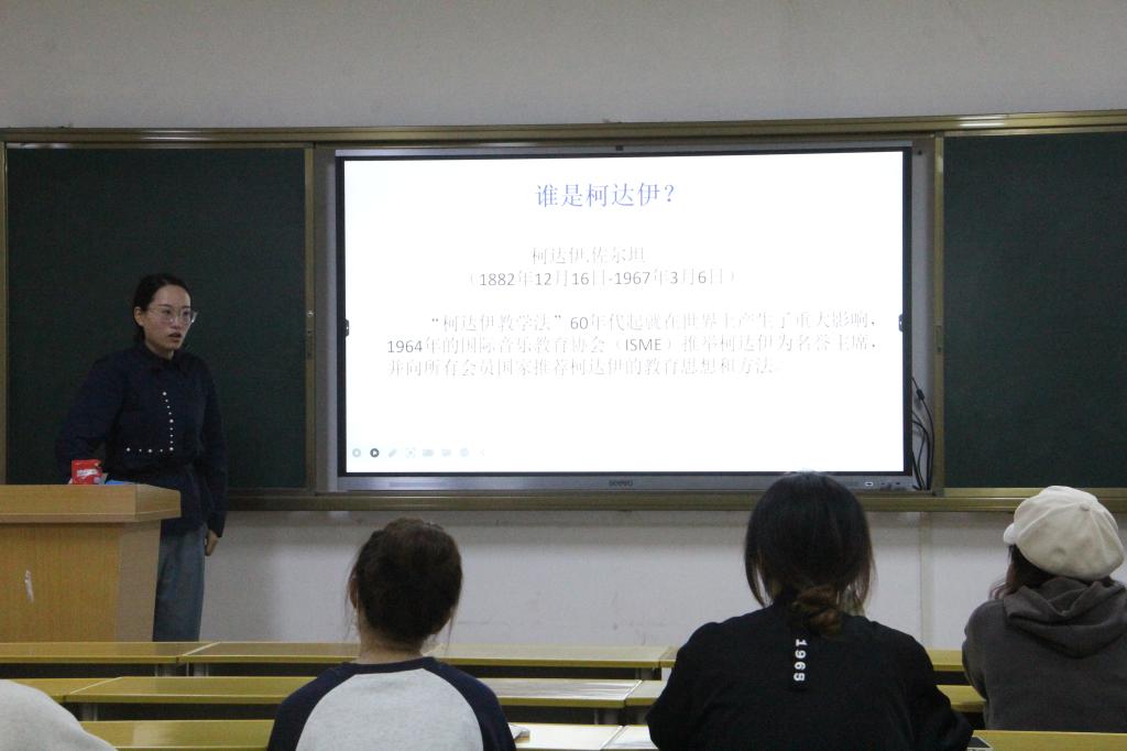 李佳琦首先阐释了柯达伊音乐教学法的具体内涵,深入讲解了柯达伊音乐教学法的教育思想、主要特点及相关作品简介。她强调柯达伊音乐教学法的教育思想共有七条,其中最核心的一条是“音乐应该属于每个人”。其次,她结合柯达伊音乐教学法的特点,以民谣《粉刷匠》为例,重点讲解了首调唱名体系的具体含义和使用方法。最后,她向同学们推荐了关于柯达伊音乐教学法的各种书籍和资料,如《333首读谱练习》《让我们准确地歌唱》等,并鼓励同学们阅读和学习。