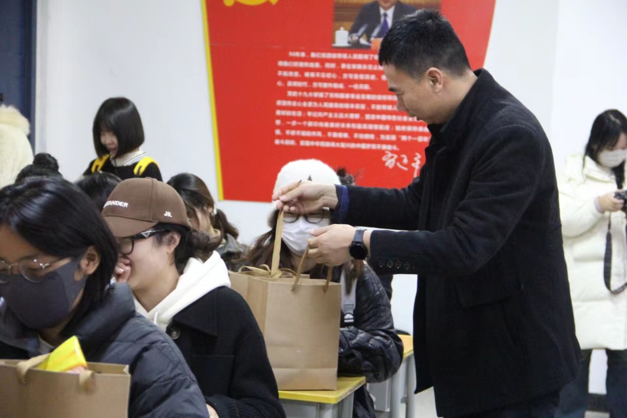 2024年研究生考试在即,备考气氛愈加浓烈。为助力考研学生坚定考研信心,及时调整状态,12月5日,我院于A104开展“凛冬送暖 研途相伴”考研慰问活动。院党委书记郎晓林、院党委副书记池琳琳、副院长王建朝、副院长杨熠、院就业创业办副主任焦鑫鑫、2020级辅导员、院团委副书记刘士英及全体考研学生参加。