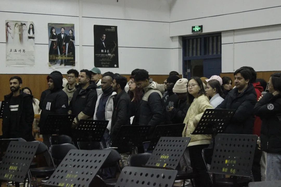 此次活动的流程分为两个主要部分。首先,由我院副院长王钧带领留学生们参观了我院的民乐团排练室、混声合唱团排练室等多个社团活动教室。他详细介绍了学院“九团二社”的特色教学活动,让留学生们对河洛文化的传承和发展有了更加深入的了解。