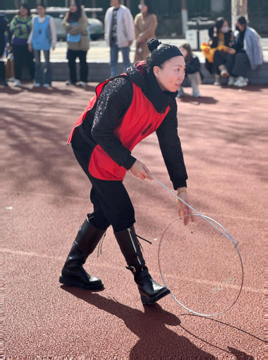 运动场上,色彩斑斓的装束和跃动的身影交织出一幅绚丽多彩的画面。在“推铁环接力赛”活动中,我院教师配合默契,步伐轻盈,赢得阵阵欢呼声。“同心鼓舞”则是一场富有节奏感和协作性的竞技,活动中,我院教师团结一致,集中精力,现场充满了紧张和刺激的氛围。在踢毽子、颗粒归仓活动中,我院教师在踢出风采的同时从容不迫,引得现场欢声笑语,热闹非凡。参赛教师们在比赛中的全身心投入,充分展现了音乐学院女教职工积极向上、顽强拼搏的精神。