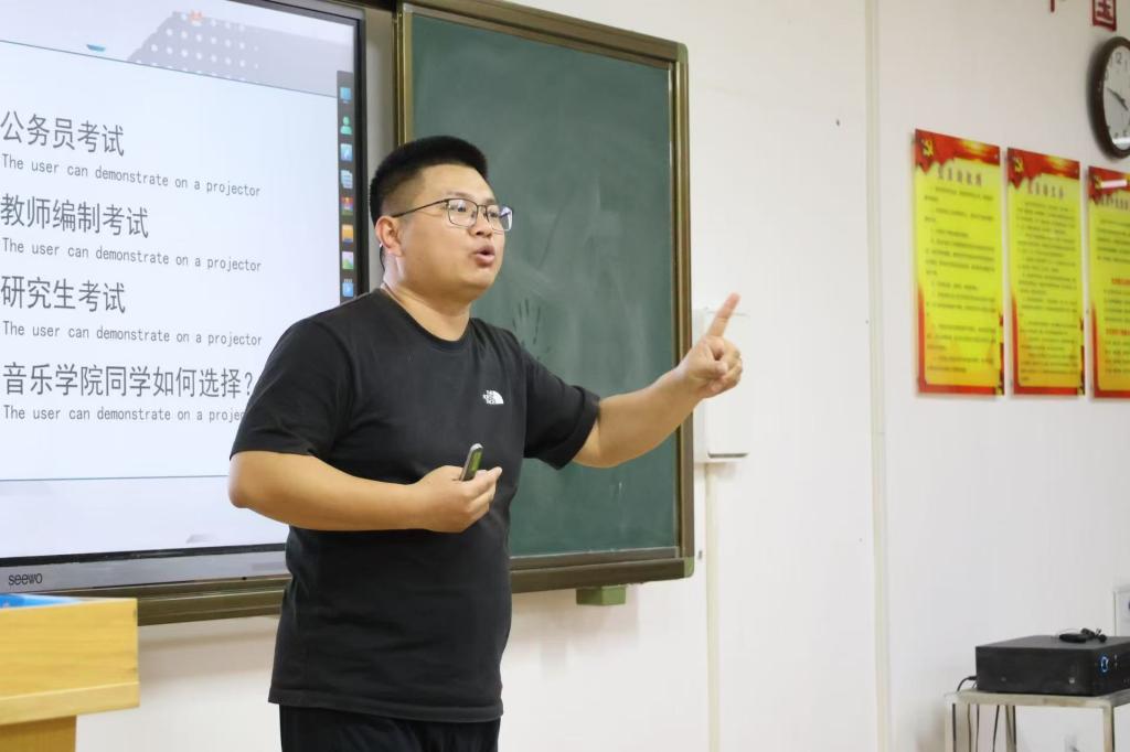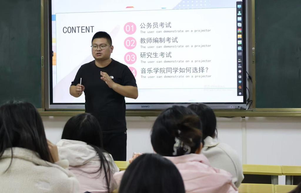 为进一步强化学风建设,加强学生职业生涯规划指导,聚焦学生关切的“考公”“考编”与考研问题,我院联合开阳书院1号学生社区于11月7日在音乐学院A104教室开展“磨刀不误砍柴工”——就业形势与政策分析专题讲座。特邀我校文学院2010级优秀毕业生、全国考研规划名师杜春龙主讲,音乐学院部分学生参会。