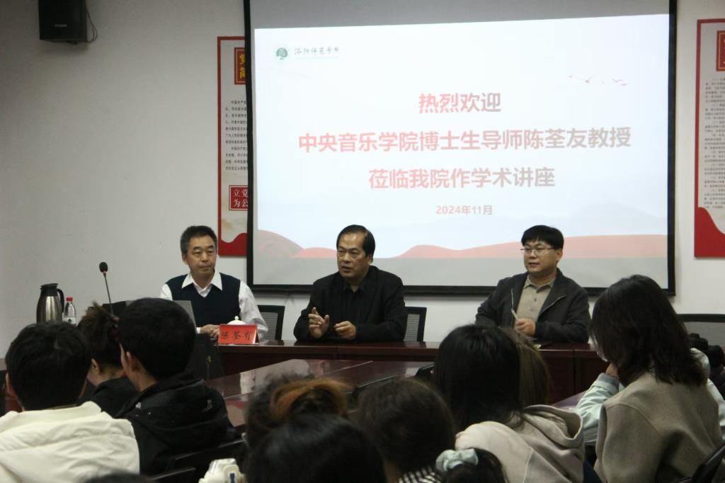 2024年11月22日下午,中央音乐学院编审,中国音乐史方向博士生导师,中国音乐史、音乐编辑与出版方向硕士生导师陈荃有教授应邀到我院讲学。我院院长郭天顺、副院长王建朝和部分师生共同聆听此次讲座。该讲座是洛阳师范学院国家级一流本科专业(音乐表演)建设点系列学术讲座之一。