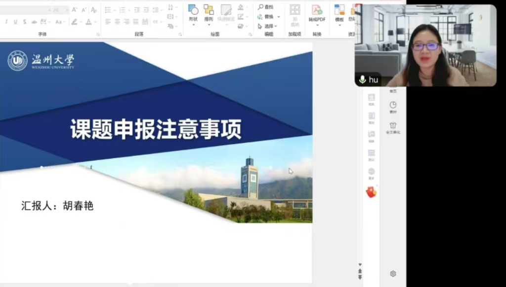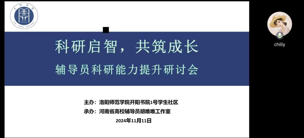 聚焦能力培养,锤炼科研本领。书院社区联合河南省辅导员胡唯唯工作室开展育人导师科研能力线上提升研讨会。工作室3位育人导师成员郝同鑫、李亚鹏、葛胜涛分享了学生工作领域的高质量文献及写作思路,拓宽育人导师学术视野。邀请温州大学胡春燕副教授作“课题申报的注意事项”专题讲座,她结合自身丰富的工作经验,深入阐述了育人导师如何将日常工作转化为科研项目,以及如何在科研实践中解决现实工作问题,为育人导师们在课题申报和科研实践方面提供了宝贵的指导。
