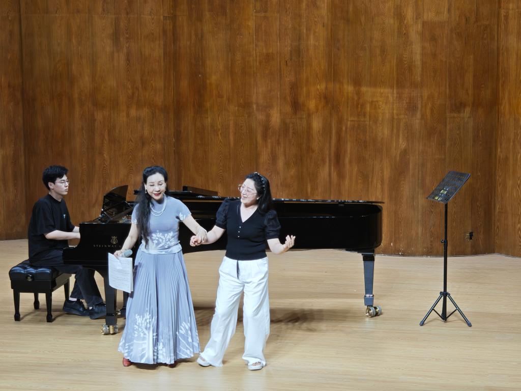 实践环节中,我院韩冰、赵丽娜两位老师上台进行示范,赵教授通过肢体语言引导和发声技巧拆解等方式展开指导教学。她针对演唱者的气息控制、咬字归韵等细节问题,进行一对一示范纠正。随后,她结合自身教学经验,为教师在日常授课中遇到的难点问题提供解决方案,明确教学重点,现场反响热烈。