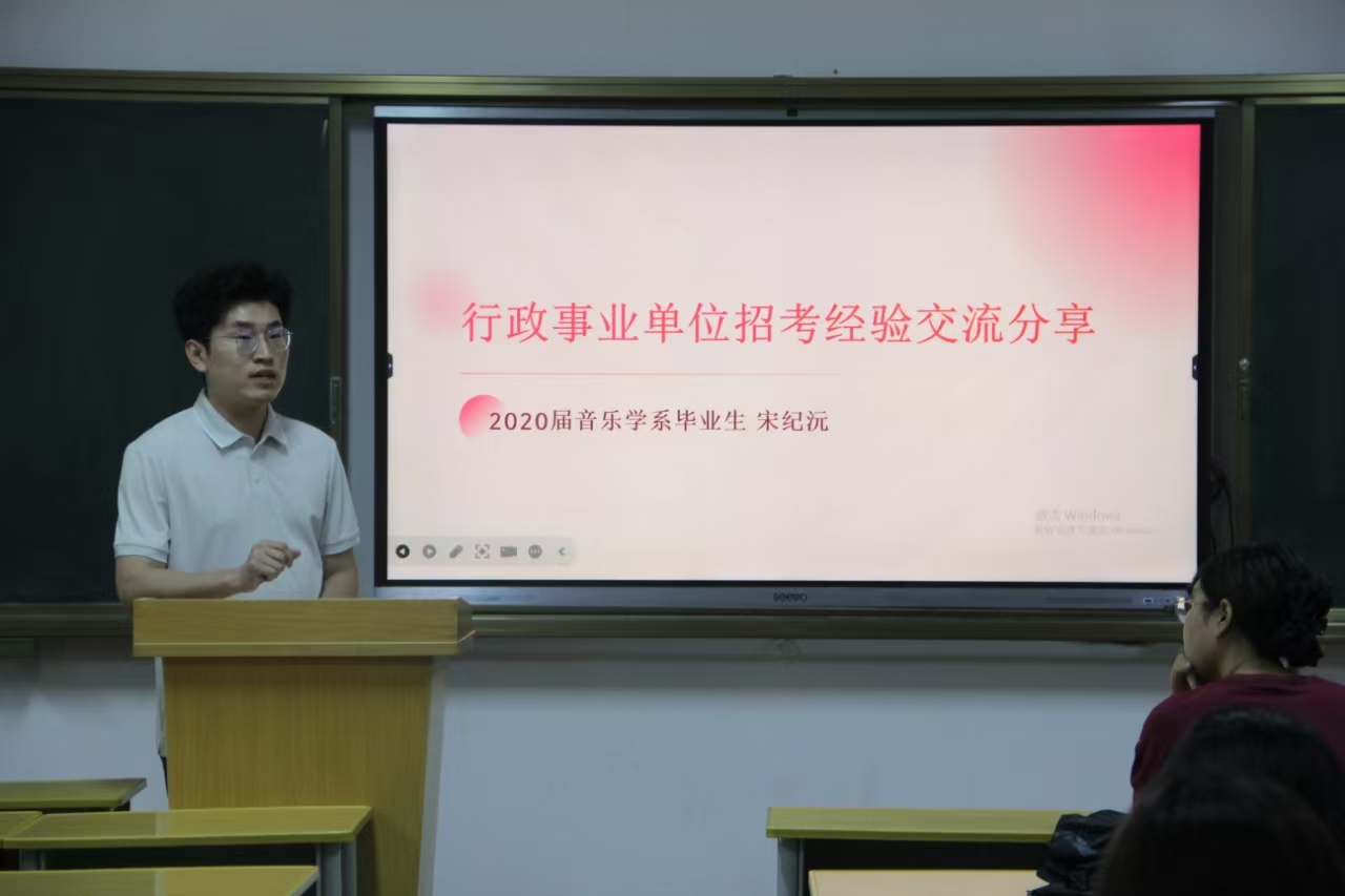5月22日下午,学院邀请洛阳市老城区委宣传部青年干部、我校优秀毕业生宋纪沅于A104教室为我院学生开展行政事业单位招考经验分享会。