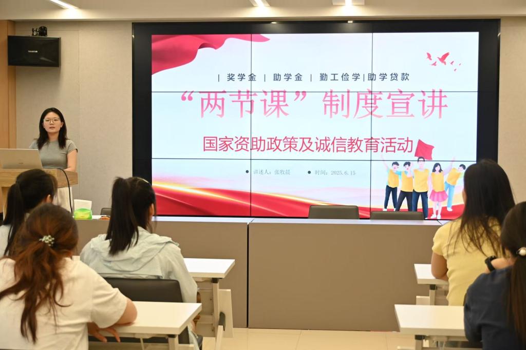 宣讲会上,张牧晨系统解读了国家资助政策体系与诚信教育内涵。通过详解国家助学贷款、国家奖学金、助学金等资助项目的申请条件、资助标准及政策优势,帮助学生精准掌握政策要点,确保教育机会公平可及。同时,结合资助感恩教育案例,引导学生树立责任意识与感恩情怀,将政策温暖转化为成长动力。活动还邀请国家励志奖学金获得者王先玲、张依琳两位同学分享受助经历与成长感悟,以朋辈视角传递奋斗精神。