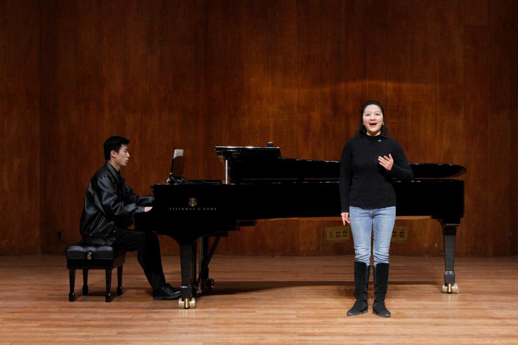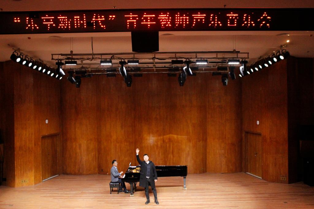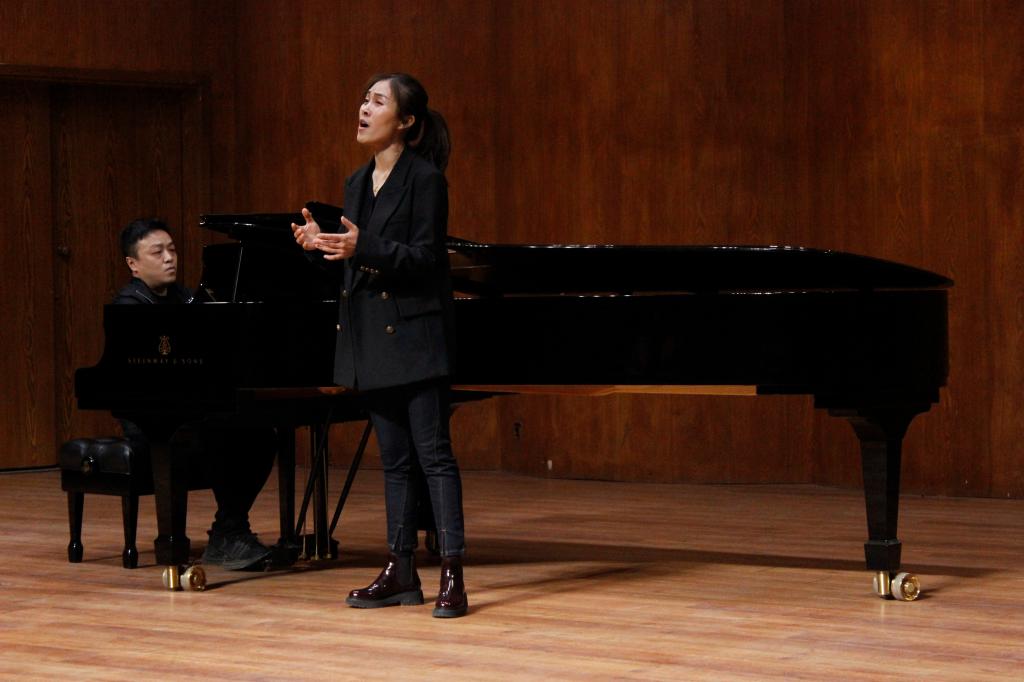 音乐会以声乐独唱的形式呈现。一首陕北民歌《上一道坡坡下一道梁》拉开了音乐会的序幕。《老家伙在找老婆》让人不禁随着轻快、活泼的曲调律动;《千古绝唱》勾勒出一段跨越千年的凄美爱情故事,感心动耳,回肠荡气;《升起吧,太阳》优美的旋律搭配演唱者细腻的情感处理带动了全场的气氛。青年教师们精彩绝伦的演唱如山涧潺潺的流水般婉转悠扬,又如大海滚滚的浪花般激荡人心、扣人心弦。随后,中国艺术歌曲、意大利歌曲、民族歌曲以及原创歌曲等作品纷至沓来。青年教师们共演绎了二十一首作品,音乐会持续了近两个小时,最后,在歌剧选段《沂蒙的女儿》中落下帷幕。