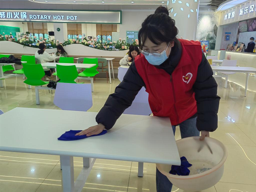 党员同志们佩戴党徽,身穿红色马甲,精神饱满,在食堂工作人员简短地讲解了注意事项之后,工作人员为志愿者们分配和明确了各自的岗位及任务,有的志愿者负责收餐、运碗、洗碗;有的志愿者拿起清洁工具,与餐厅工作人员一同打扫餐厅地板、清洁餐桌油污残羹,有的在餐厅售饭区对学生就餐进行文明排队疏导......中午一点十分,志愿者们的工作接近尾声。“我今天才知道原来后勤工作人员那么辛苦!”“对啊,都没有周末……”“以后要珍惜他们的劳动成果……” 志愿者们纷纷表示此次活动给他们带来了很深的感触。