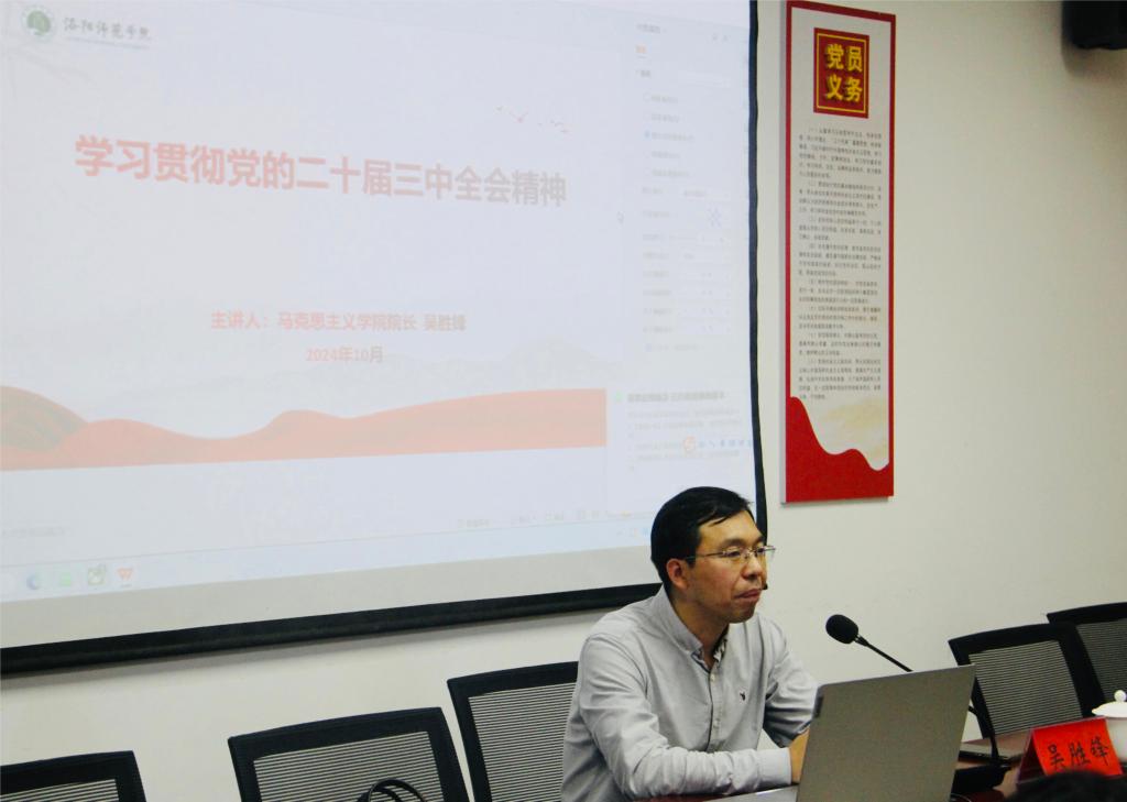 为深入学习贯彻党的二十届三中全会精神,以学促宣、深学笃行,增强广大师生学习贯彻全会精神的思想自觉和行动自觉。10月16日下午,校党委宣讲团成员、马克思主义学院院长吴胜锋走进音乐学院,为我院师生作“深入学习贯彻党的二十届三中全会精神”的专题宣讲,宣讲会由院党委副书记池琳琳主持。