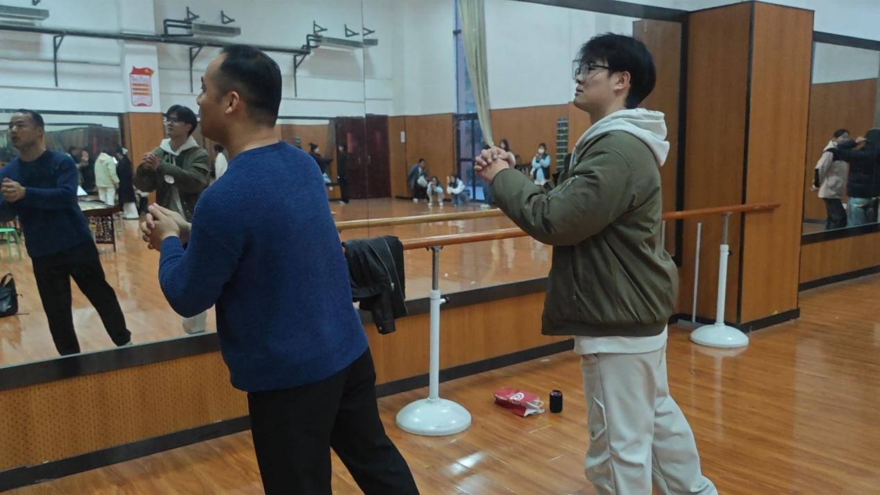 3月11日至4月17日,三位同学进入集训阶段,围绕自弹自唱、合唱指挥及自选才艺三大项目展开专项训练。集训课程安排合理,张轩宁老师负责自弹自唱指导,赵珊老师负责合唱指挥训练,自选才艺项目则由多位专业老师指导:裴世阳学习戏曲表演(指导老师饶骞)、全营学习舞蹈(指导老师闫小飞)、杨宇展示古筝演奏(指导老师王倩楠)。除集中授课外,同学们在课余时间也自发练习,力求精益求精。4月17日下午,常丽梅院长与郑天翔老师、赵珊老师在音乐学院B108排练教室亲切慰问三位参赛同学,并给予比赛前的专业指导与心理疏导。