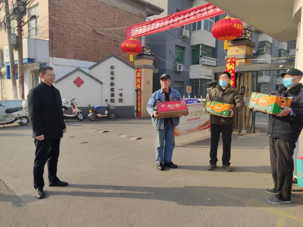 1月22日农历大年初一,洛阳师范学院资产经营有限责任公司总经理乔景润到校区、物业小区看望慰问各中心坚守岗位的职工;对他们坚守一线,辛勤工作表示感谢,并为他们送去节日的问候和新春的祝福;公司办公室人员及各中心相关负责人陪同。
