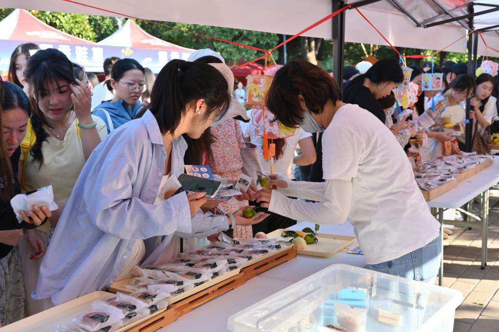 在“墨香雅集”区域,书法爱好者们以笔墨书写美好愿景,创作了一幅幅庆祝中秋佳节的书法佳作。现场设置了互动体验区,在书法教师的指导下,大家一同写下祝福寄语给家人,抒发思乡爱国之情。活动还特别引入了漆扇彩绘,大家通过亲自动手制作漆扇,体验感受中国传统工艺的魅力。在欢声笑语中,师生们纷纷拿出手机在现场拍照留念,并与亲朋好友分享,整个广场洋溢着浓厚的节日气氛。现场还特别定制了带有洛师元素的月饼和水果等节日礼品,在送上节日祝福的同时,让广大师生切实感受到学校的温暖和关怀。
