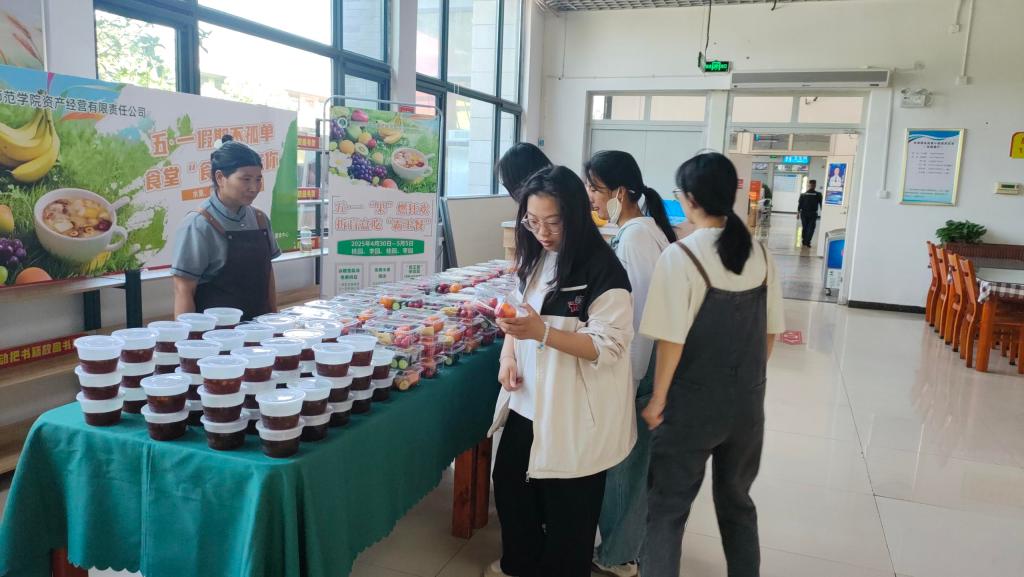 五一期间四个餐厅投放黄瓜、酥梨、沃柑、香蕉、小番茄等果蔬共计约4000余斤,冰糖雪梨汤5000余碗,免费餐券3万余元。